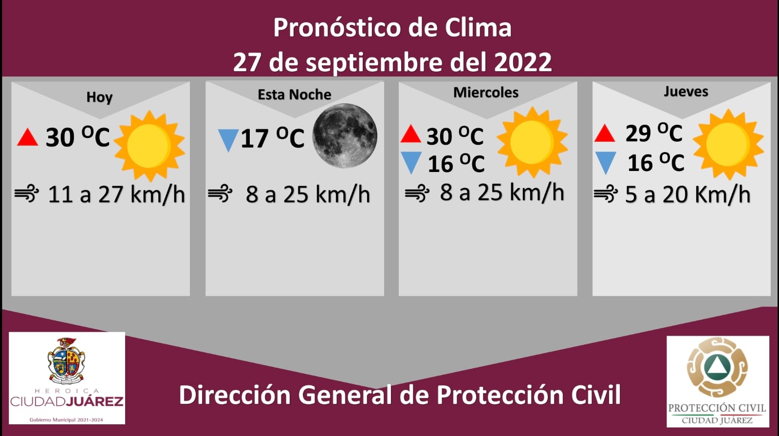 Para mañana miércoles se pronostica un día soleado, con una temperatura máxima de 30 °C y mínima de 16 °C, la velocidad del viento será de 8 a 25 kilómetros por hora.