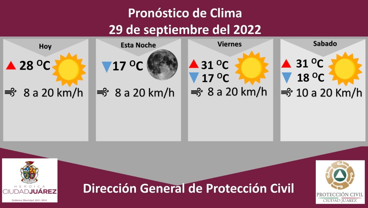 Para mañana viernes se espera de nueva cuenta un día soleado con una temperatura máxima de 28 °C y mínima de 17 °C, la velocidad del viento oscilará de 8 a 20 kilómetros por hora.