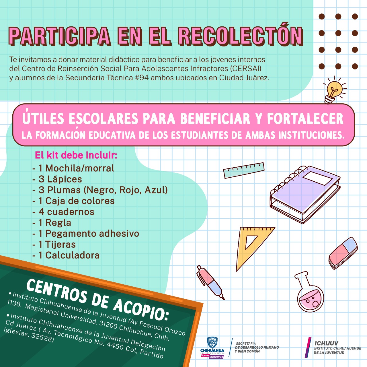 El Gobierno del Estado, a través del Instituto Chihuahuense de la Juventud (Ichijuv), convoca a la ciudadanía a donar material didáctico en beneficio de adolescentes y jóvenes de Ciudad Juárez, mediante la campaña “Recolectón”.