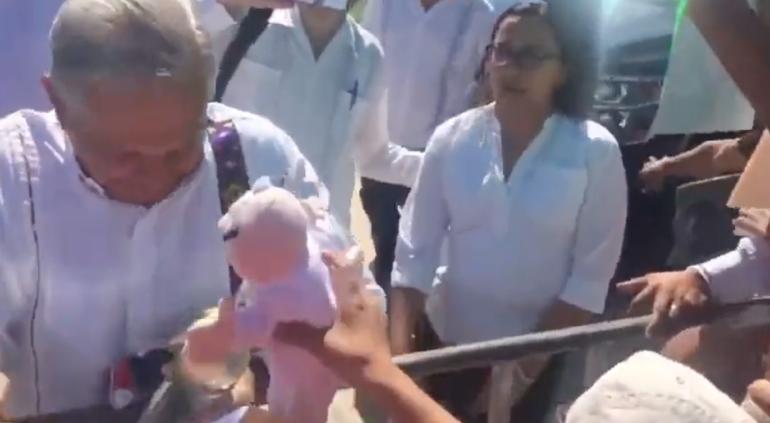 Ahora fue el presidente Andrés Manuel López Obrador quien recibió el peluche, durante su llegada al municipio de Mitla, Oaxaca.