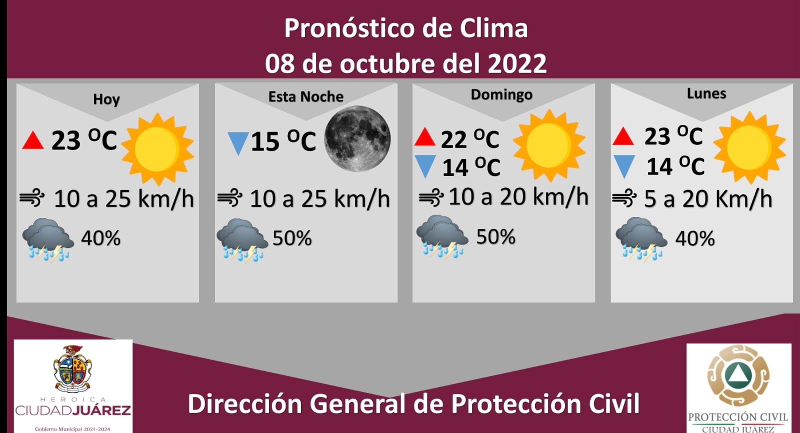Para mañana domingo la probabilidad de lluvia será de un 60 por ciento, se espera una temperatura máxima de 24 °C y una mínima de 15 °C, los vientos se pronostican de 10 a 25 kilómetros por hora.