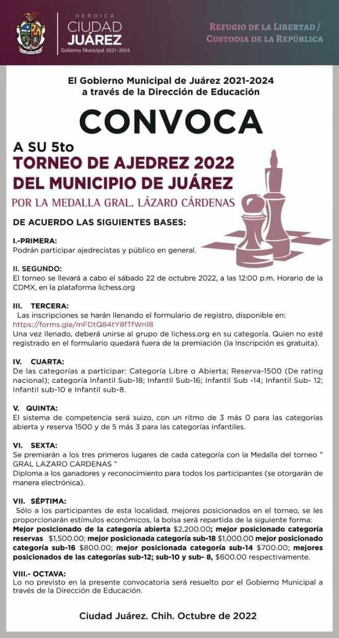 El Gobierno Municipal, a través de la Dirección de Educación invita a la ciudadanía a participar en el Quinto Torneo de Ajedrez del Municipio de Juárez por la medalla “Gral. Lázaro Cárdenas”.