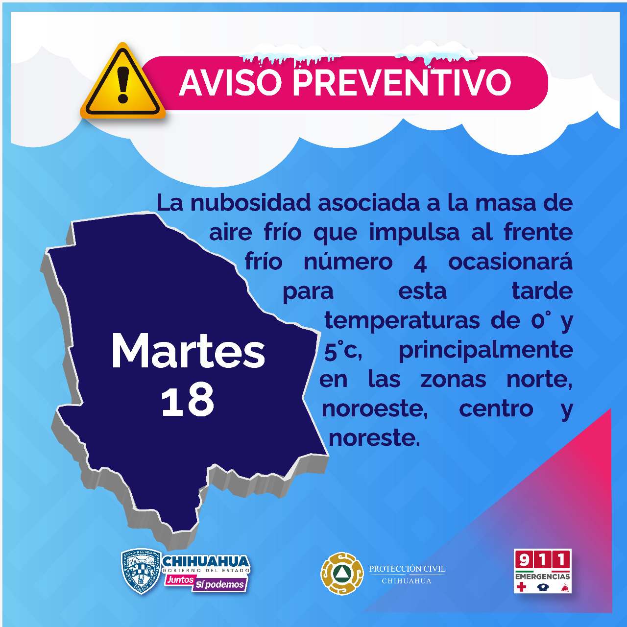 Por otra parte el pronóstico para este día y próximas 72 horas, la masa de aire frío que acompaña al sistema frontal mantendrá la presencia de lluvias en el estado y de un marcado descenso de temperaturas, las cuales podrán tener mayor presencia en el territorio a partir de esta tarde, por tanto, la dependencia estatal emite una alerta ante el pronóstico de temperaturas de -2° y -3° centígrados en Majalca, Madera, Temósachic, Creel, Guachochi y El Vergel.