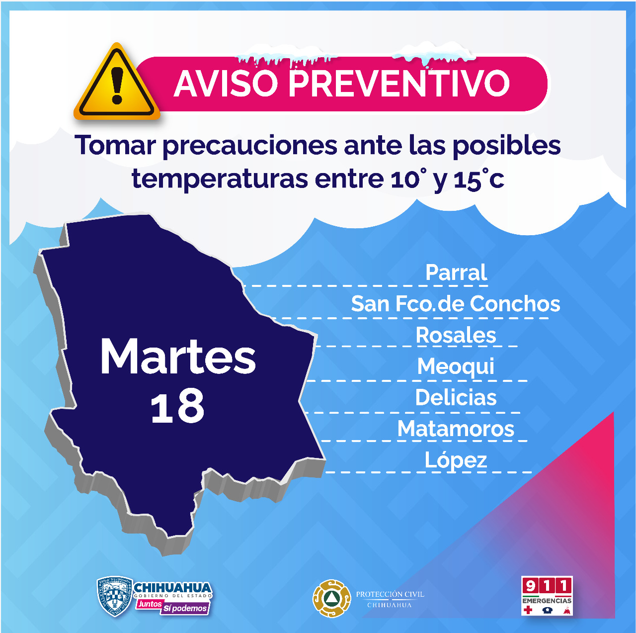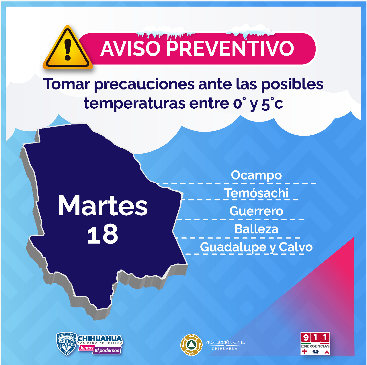 La CEPC, pide a la población mantener las medidas preventivas ante la presencia de lluvias y descenso de temperaturas, ya que los municipios con mayor descenso son Ocampo, Bocoyna, Guerrero, Guadalupe y Calvo y Balleza son las áreas en donde el valor mínimo de temperatura podrá encontrarse entre 0 y 5°C con potencial presencia de heladas.