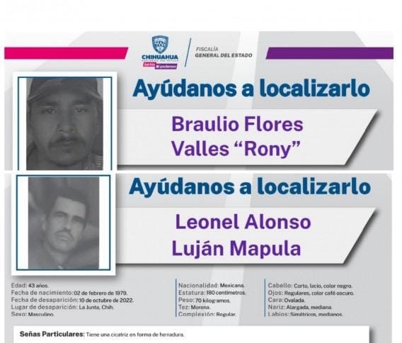 Los cuerpos fueron identificados como quienes se llamaban Leonel Alonso Luján Mapula, de 43 años y Braulio Flores Valles, de 32 años de edad; ambos habían sido reportados como desaparecidos desde el pasado 10 de octubre, último día en que se reportaron con sus familiares quienes manifestaron que los dos fallecidos, junto con una mujer habían salido de La Junta, Gro. hacia Puerto Palomas, pero que ya no supieron nada de ellos luego de la comunicación que tuvieron vía teléfono.