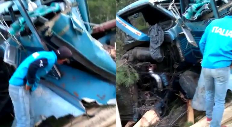 En ellas se aprecia un tráiler de cabina azul con el frente totalmente destrozado. El mismo iba cargado con tablas de madera, las cuales quedaron esparcidas debajo de la plataforma del semirremolque.