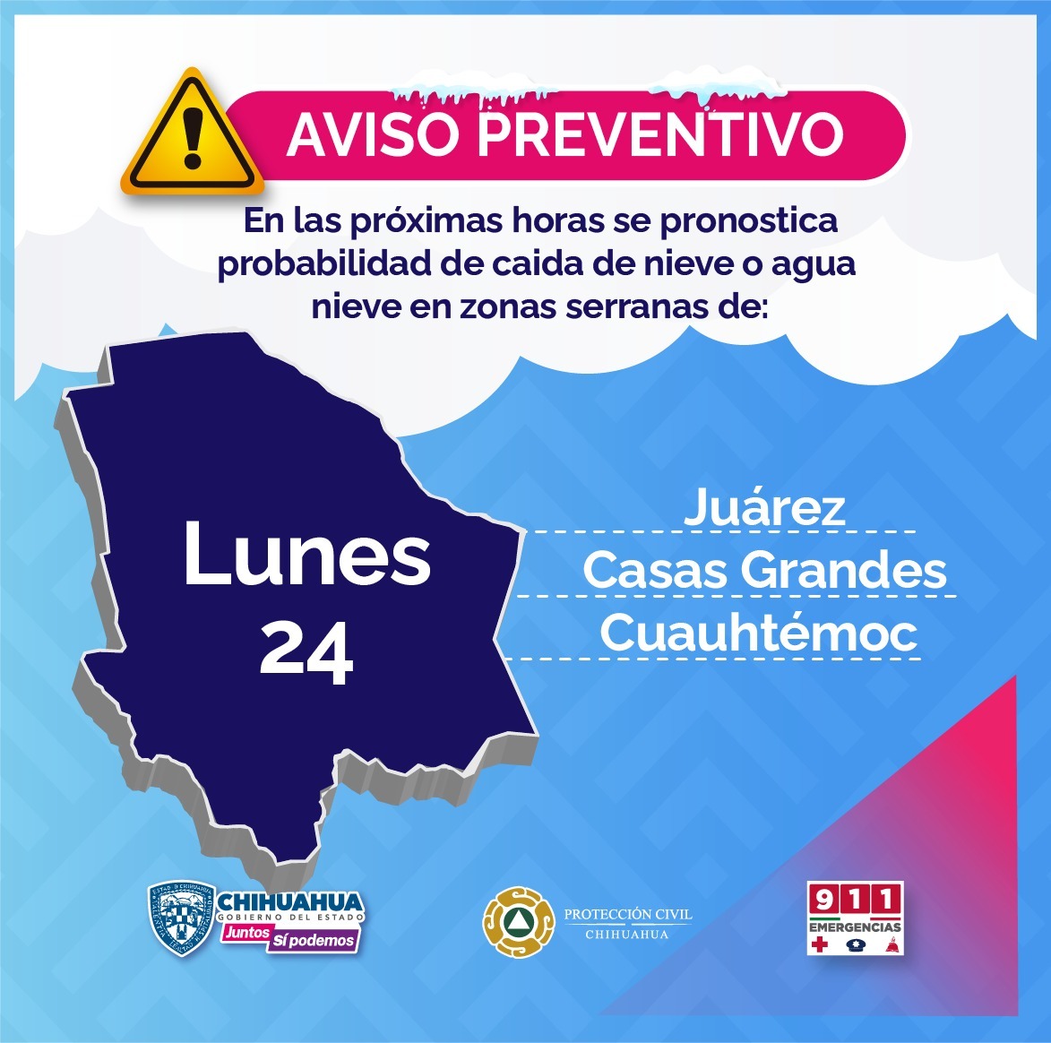 Durante estos días, se espera un descenso de la temperatura, así como fuertes rachas de viento, precipitaciones pluviales con posibilidad de ligera caída de nieve en zonas altas de las regiones de la frontera norte, Juárez, y Casas Grandes.