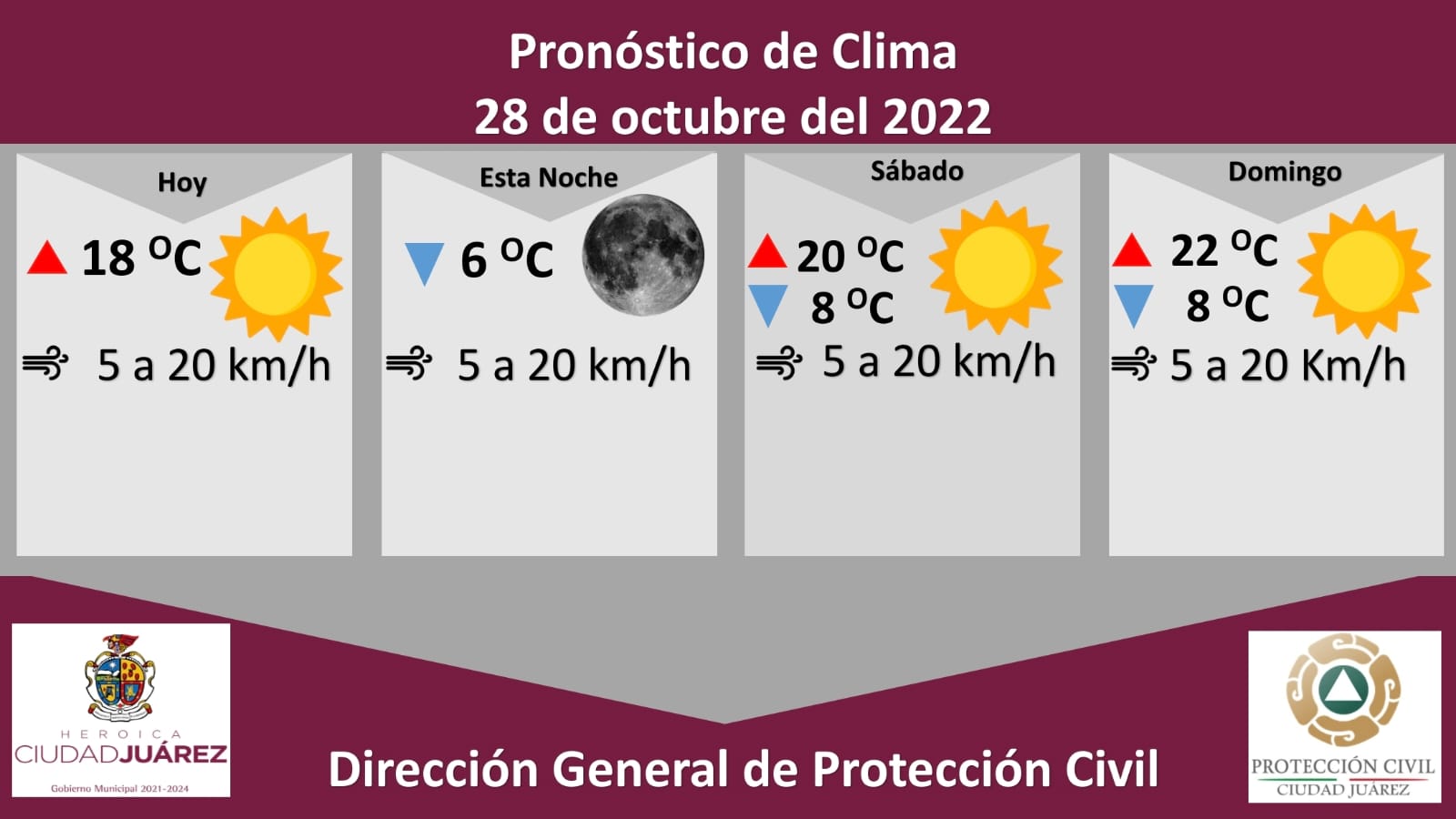 La Dirección General de Protección Civil, con base en informes del Servicio Meteorológico Nacional, pronostica una temperatura máxima de 18 grados Celsius para este viernes, mientras que la mínima se espera en 6 °C, informó Roberto Briones Mota titular de la dependencia.