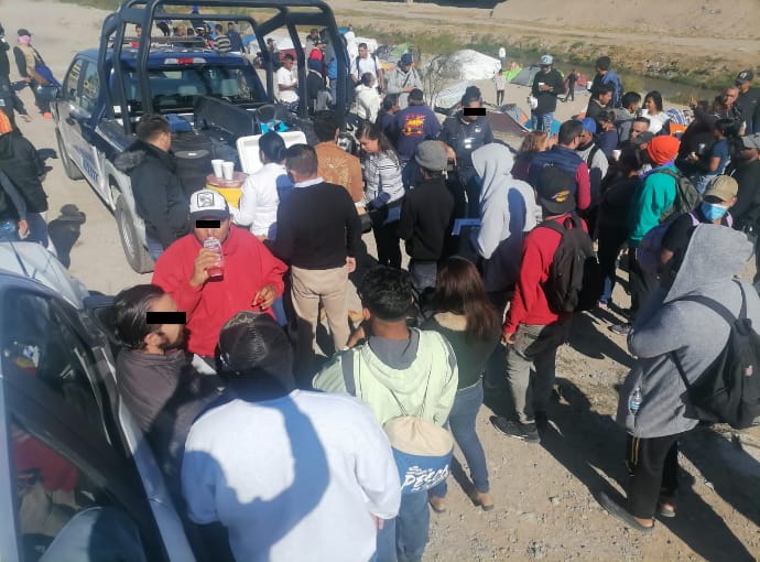 Personal de la Secretaría de Seguridad Pública del Estado (SSPE), acudió al campamento en el que habitan personas migrantes procedentes de Venezuela a la orilla del Río Bravo, en la frontera con Estados Unidos para apoyarlos con bebidas calientes y alimentos.