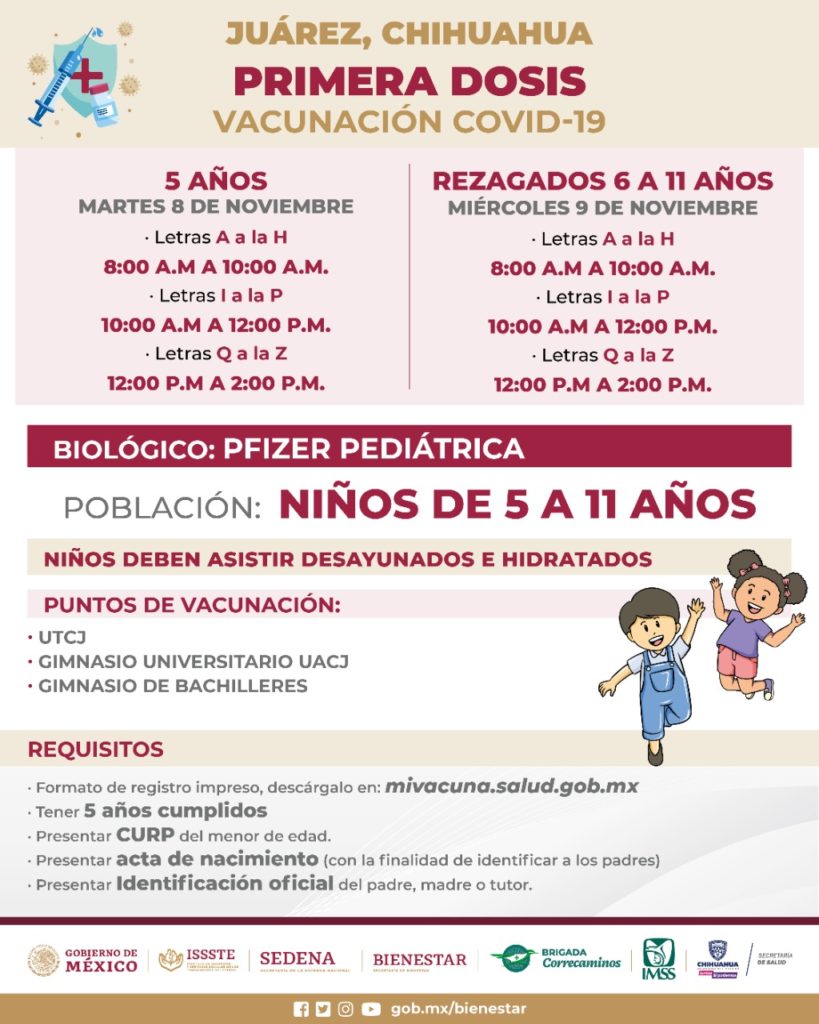 La delegación regional de los Programas de Bienestar informó que los días 8 y 9 de noviembre se llevará a cabo la aplicación de la vacuna contra el Covid-19 para los niños de 5 años, además de atención para los rezagados de 6 a 11 años.