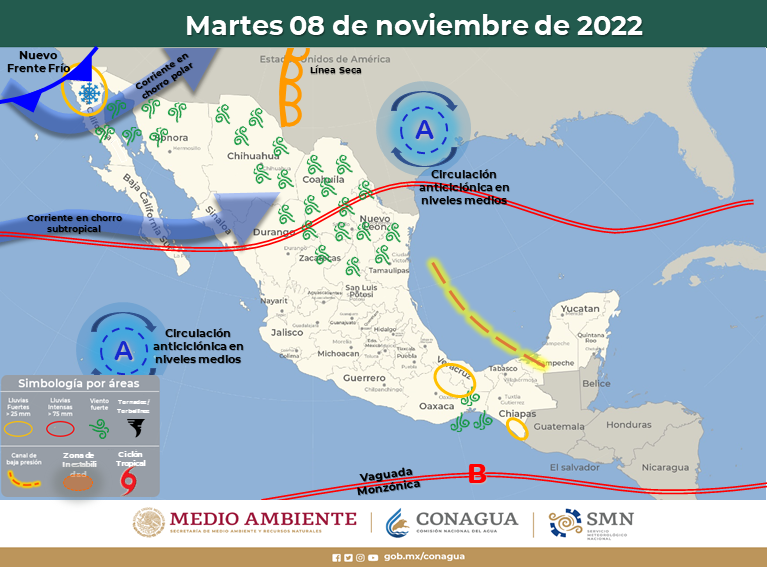 El nuevo frente frío se aproximará al noroeste del territorio nacional, se asociará a una vaguada polar y en interacción con la corriente en chorro polar, originarán lluvias puntuales fuertes con rachas de viento en Baja California, además condiciones para la caída de aguanieve o nieve, principalmente en la madrugada o primeras horas del miércoles en la sierra de La Rumorosa y San Pedro Mártir, B.C.