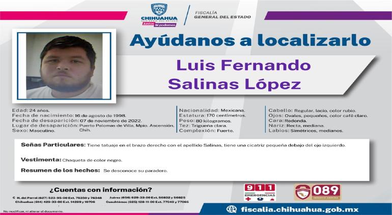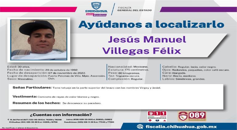 La Fiscalía y familiares piden ayuda para encontrar a tres jóvenes que desaparecieron el 7 de noviembre del presente año en Puerto Palomas de Villa, Chihuahua. Por el momento se desconoce su paradero.