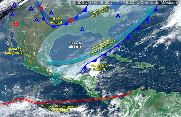 Además, el frente frío Núm. 8 se desplazará sobre el noroeste de México y mantendrá interacción con una vaguada polar y con las corrientes en chorro subtropical y polar, y ocasionarán fuertes rachas de viento y descenso de temperatura en la región mencionada, además de lluvias con chubascos y probabilidad para la caída de aguanieve o nieve durante la mañana en sierras de Baja California.
