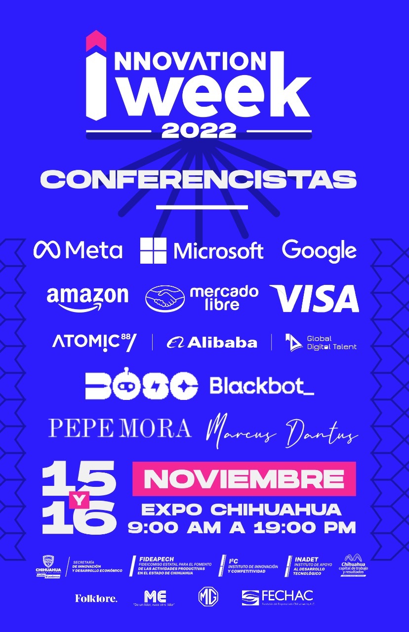 Gobierno del Estado, a través de la Secretaría de Innovación y Desarrollo Económico, invita a Innovation Week 2022, los días 15 y 16 de noviembre en un horario de 9:00 a 19:00 horas, en Expo Chihuahua. El evento tiene el objetivo de impulsar y fortalecer el ecosistema de innovación, tecnología y emprendimiento de Chihuahua, contará con la participación y conferencias de expertos de empresas globales como Facebook, Google, Amazon, Microsoft y Mercado Libre, entre otros, además del empresario Marcus Dantus.