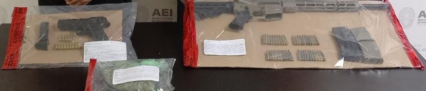 En el interior de la vivienda fueron aseguradas, una pistola calibre 9mm marca Lugger y un arma tipo fusil calibre 2.23 marca Multi, ambas con los números de serie ilegibles, además, una bolsa que contenía 80 gramos de enervante con las características propias de la marihuana.