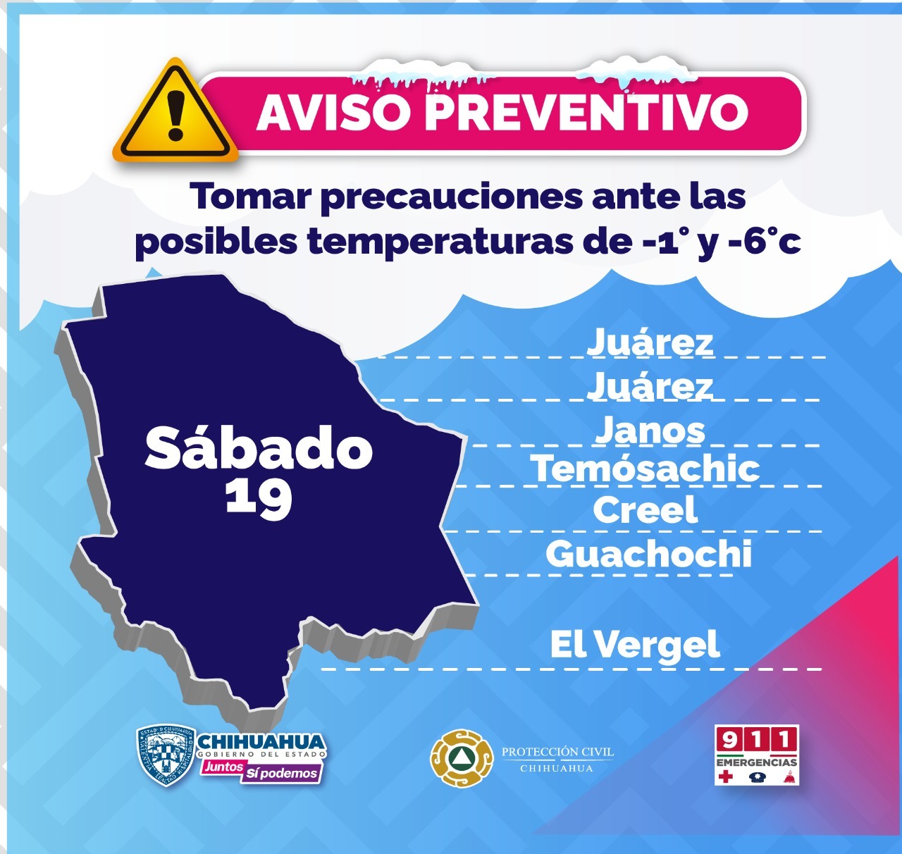 Ante estas condiciones la CEPC anuncia que las temperaturas mínimas para este fin de semana oscilarán dentro de los 2 a 3 grados centígrados (°C ) en región de Juárez, Chihuahua de 3 a 4 °C, Casas Grandes de 1 a 3 °C, Camargo de 5 a 6 °C, Cuauhtémoc de 0°C, Parral de 3 a 7 °C, Guachochi 0°C, Ojinaga 6°C, Delicias 4°C y Jiménez de 5 a 7 °C.