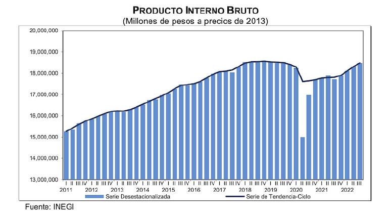 En los primeros nueve meses de 2022 y con series desestacionalizadas, el PIB aumentó 2.8 % a tasa anual.
