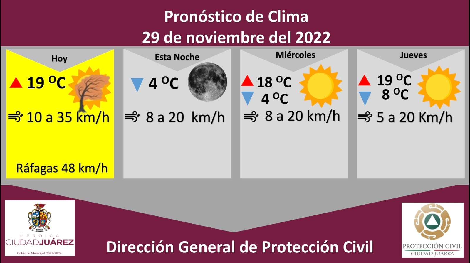 Para hoy se espera una temperatura máxima de 19 °C y mínima de 4 °C, la velocidad del viento será de 8 a 35 kilómetros por hora.