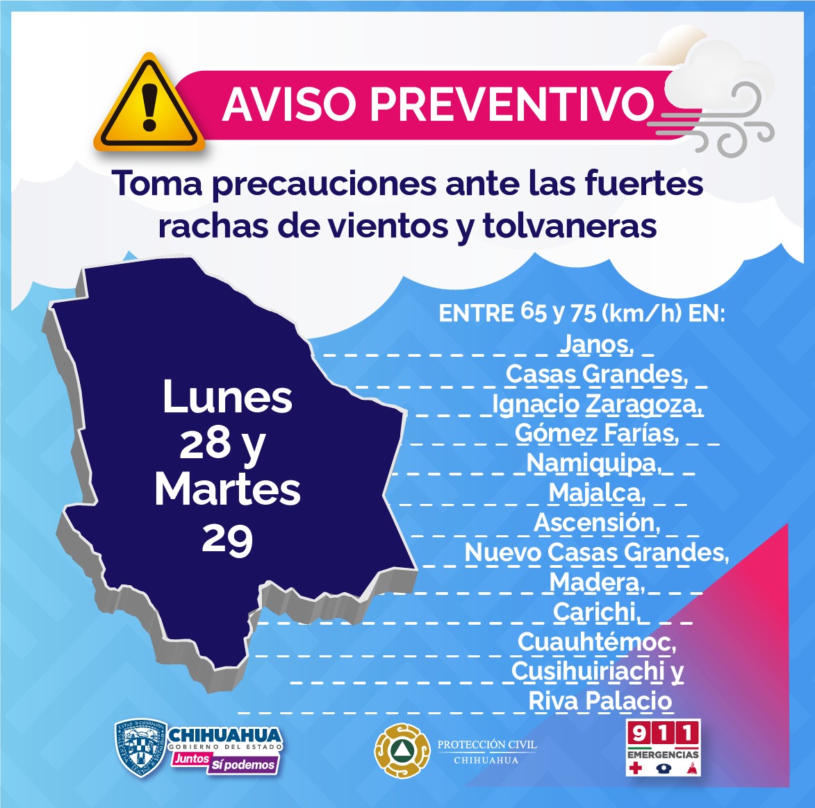 Para este lunes 28 y martes 29, el pronóstico emitido por el Servicio Meteorológico Nacional, indica que, un sistema frontal y una vaguada polar en el noroeste del país, traerá fuertes rachas de viento durante esta tarde noche, que pueden superar los 65 a 75 kilómetros por hora (km/h) en Janos, Casas Grandes, Ignacio Zaragoza, Gómez Farías, Namiquipa, Majalca, Ascensión, Nuevo Casas Grandes, Madera, Carichi, Cuauhtémoc, Cusihuiriachi y Riva Palacio.