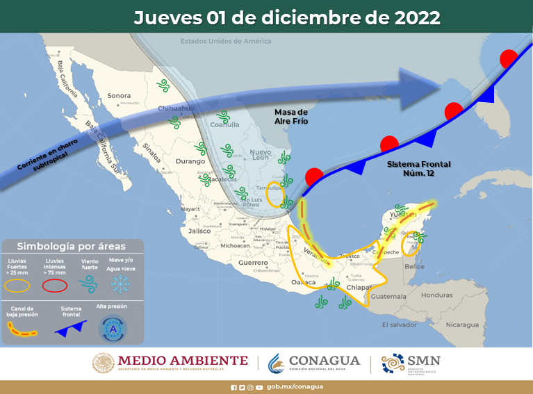 Así como densos bancos de niebla a lo largo de la Sierra Madre Oriental, y durante la mañana, evento de “Norte” en costas de Tamaulipas y Veracruz; esta última condición se debilitará debido a que dicha masa de aire se desplazará hacia el sureste de Estados Unidos.