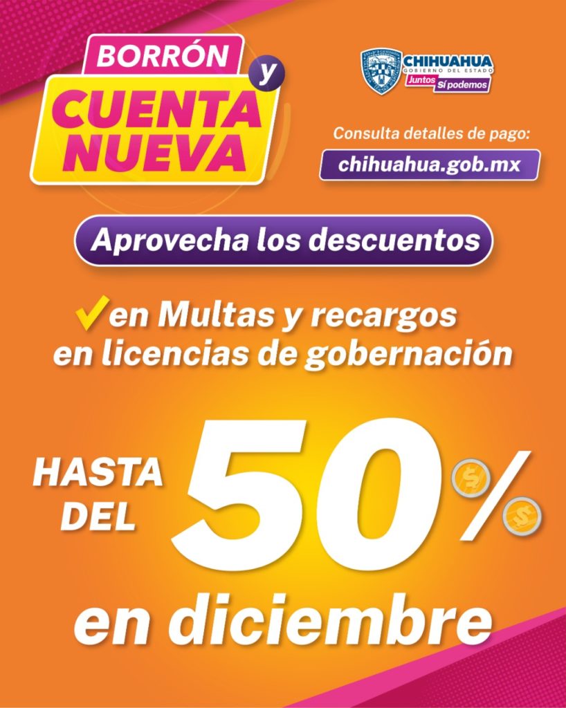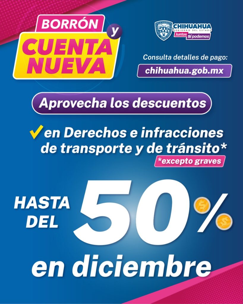 La Secretaría de Hacienda de Gobierno del Estado informa que durante el mes de diciembre continuarán los descuentos del programa “Borrón y cuenta nueva”, por lo que se invita a la población a acudir a realizar su pago para ponerse al corriente en sus adeudos en impuestos estatales.