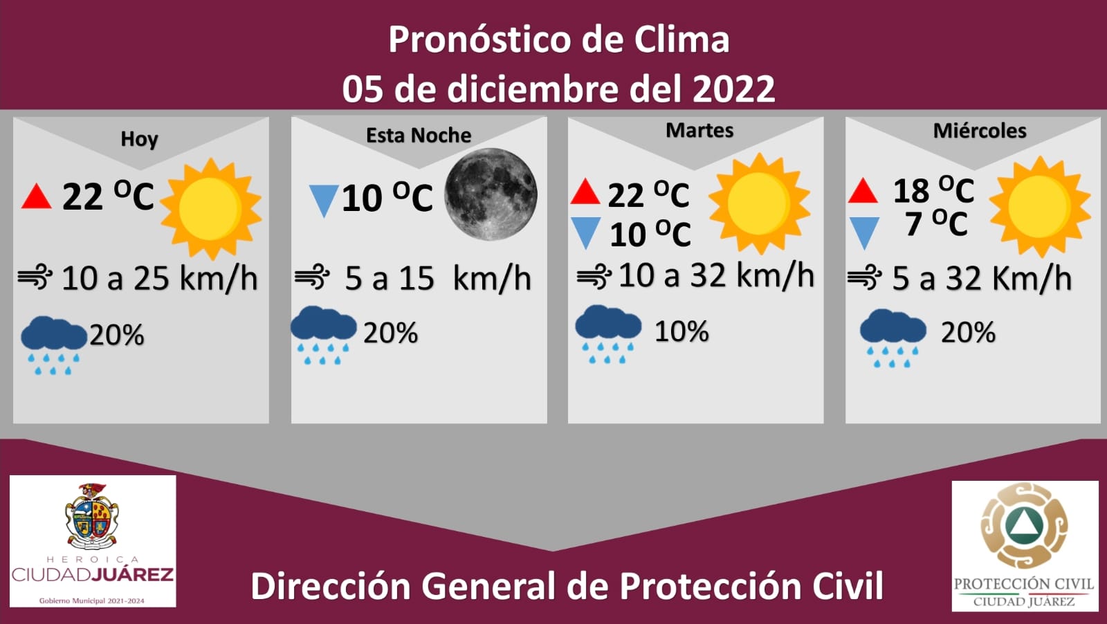 Para mañana martes existe una probabilidad de lluvia de un 10 por ciento, se espera una temperatura máxima de 22 °C y mínima de 10 °C, la velocidad del viento se pronostica de 10 a 32 kilómetros por hora.