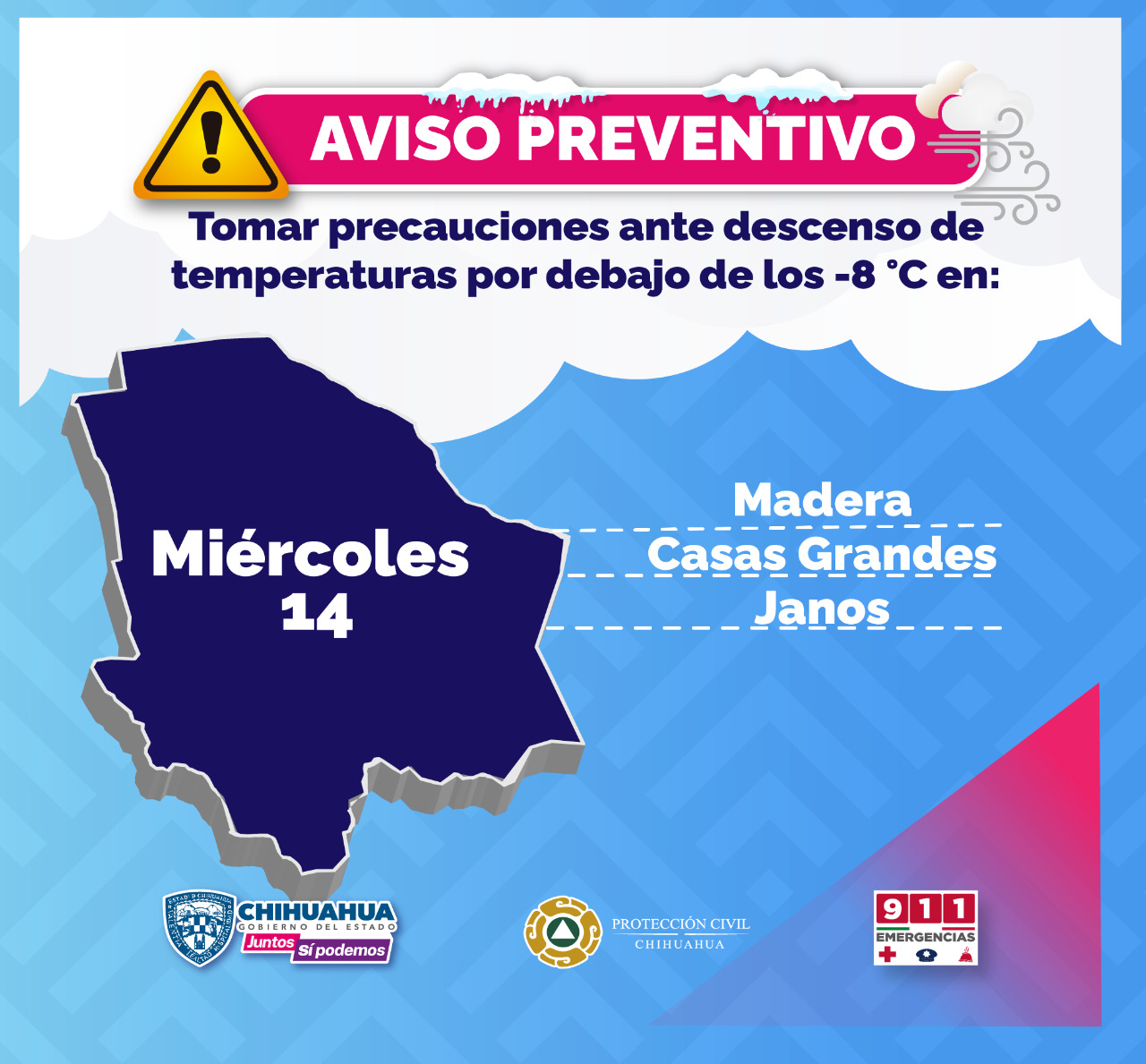 Con base en la información emitida por el Servicio Meteorológico Nacional, la CEPC, indicó que, para este día se espera un marcado descenso en el termómetro, de por debajo de los -8 grados centígrados en Madera, Casas Grandes y Janos (°C).