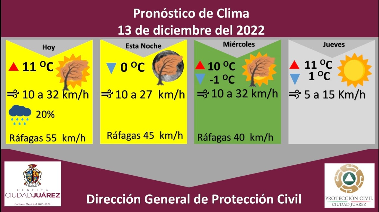 La Dirección General de Protección Civil, con base en informes del Servicio Meteorológico Nacional, emite una alerta amarilla para este martes debido a fuertes ráfagas de viento que alcanzarán los 55 kilómetros por hora, además existe una probabilidad de lluvia de un 20 por ciento, informó Roberto Briones Mota, titular de la dependencia.