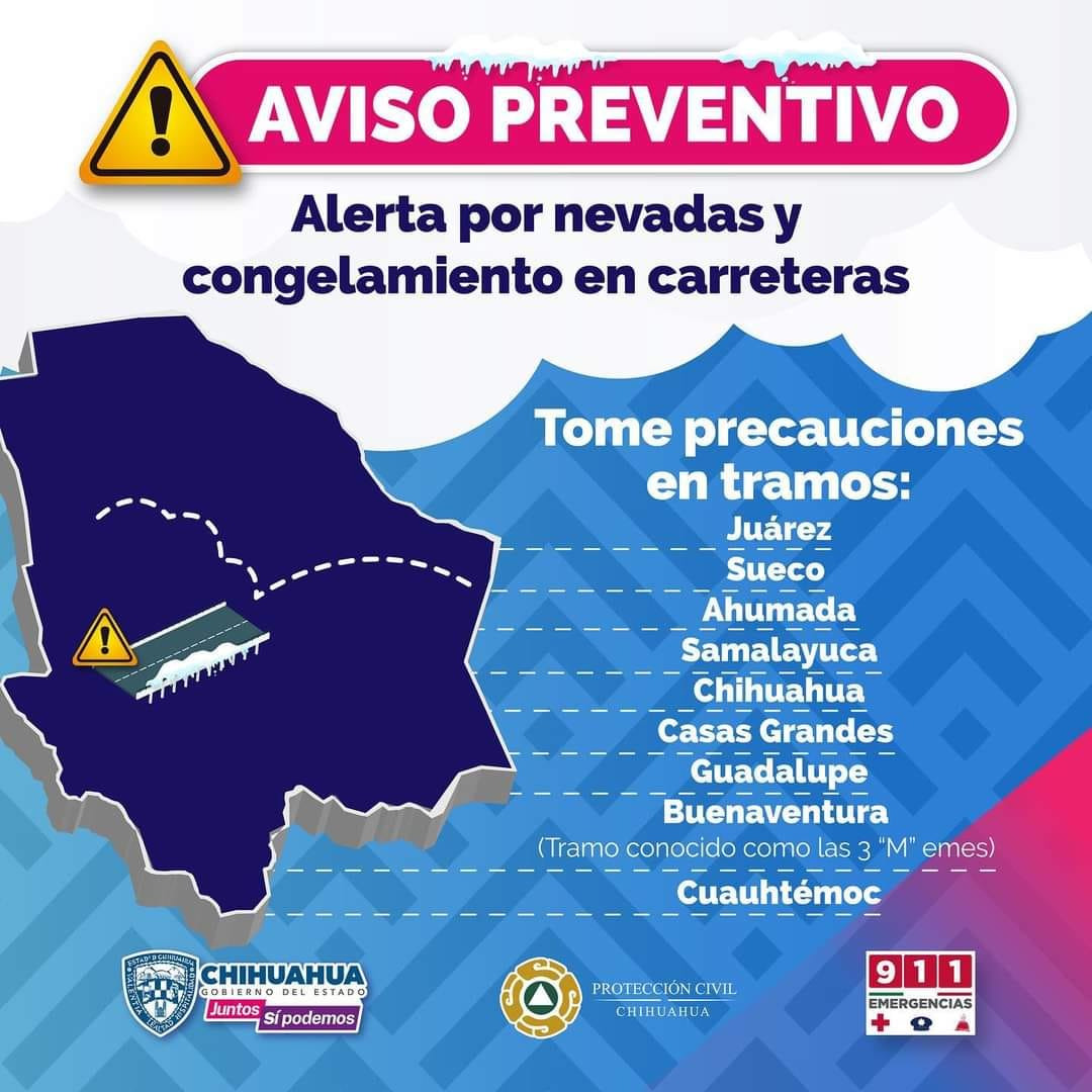 La CEPC prevé la posibilidad de congelamientos de tramos carreteros como Sueco, Ahumada, Chihuahua-Juárez, Samalayuca, Puerto San Luis, tramo conocido como las 3 “M” emes y carretera Cuauhtémoc.