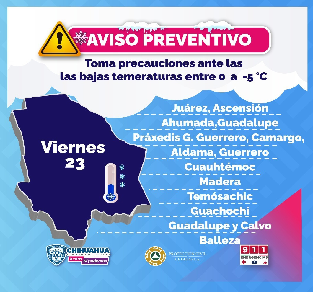 Esto debido a que principalmente en durante la noche, el termómetro podría registrar desde los 0 hasta los -12 grados centígrados para este próximo 24 y 25 de diciembre sobre la región fronteriza, como Juárez, Guadalupe, Praxedis G. Guerro, Ojinaga, Manuel Benavides, Coyame y Ahumada.