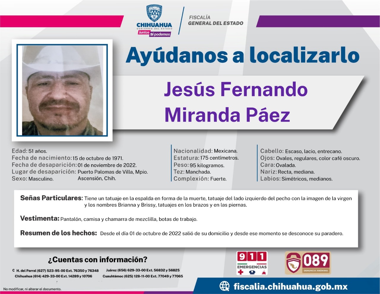 De acuerdo con el reporte de ausencia y/o extravío interpuesto por sus familiares, Jesús Fernando, de 51 años de edad, desapareció el 01 de noviembre de 2022, en la citada población fronteriza, donde fue visto por última vez cuando salió de su domicilio.