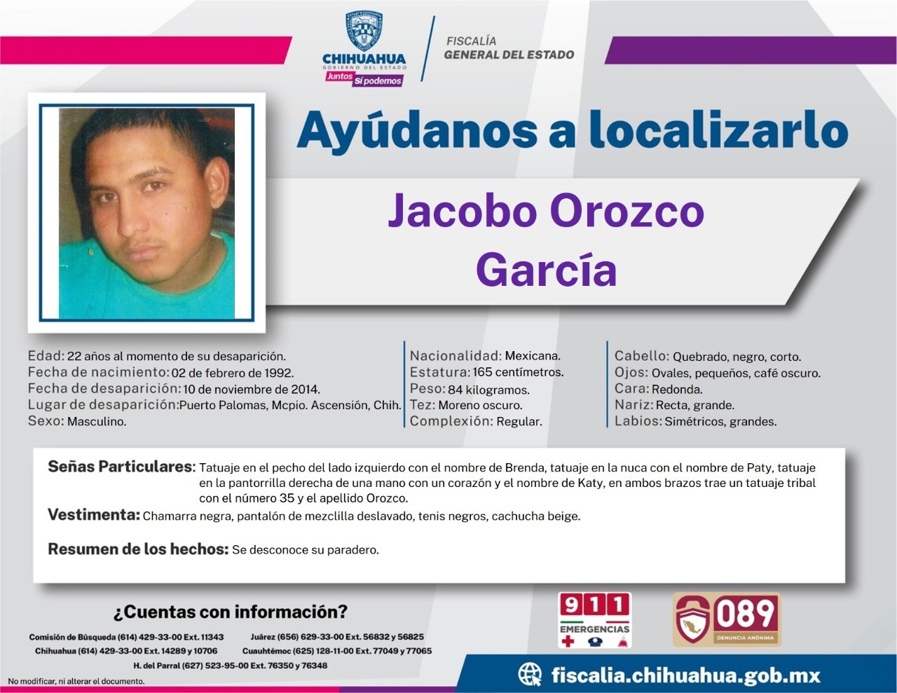 En seguimiento a la ausencia o extravío del C. Jacobo Orozco García, quien se encuentra desaparecido desde el día 10 de noviembre del 2014, se realizó un rastreo en las inmediaciones del Rancho El Pajarito, en el municipio de Casas Grandes, Chihuahua.