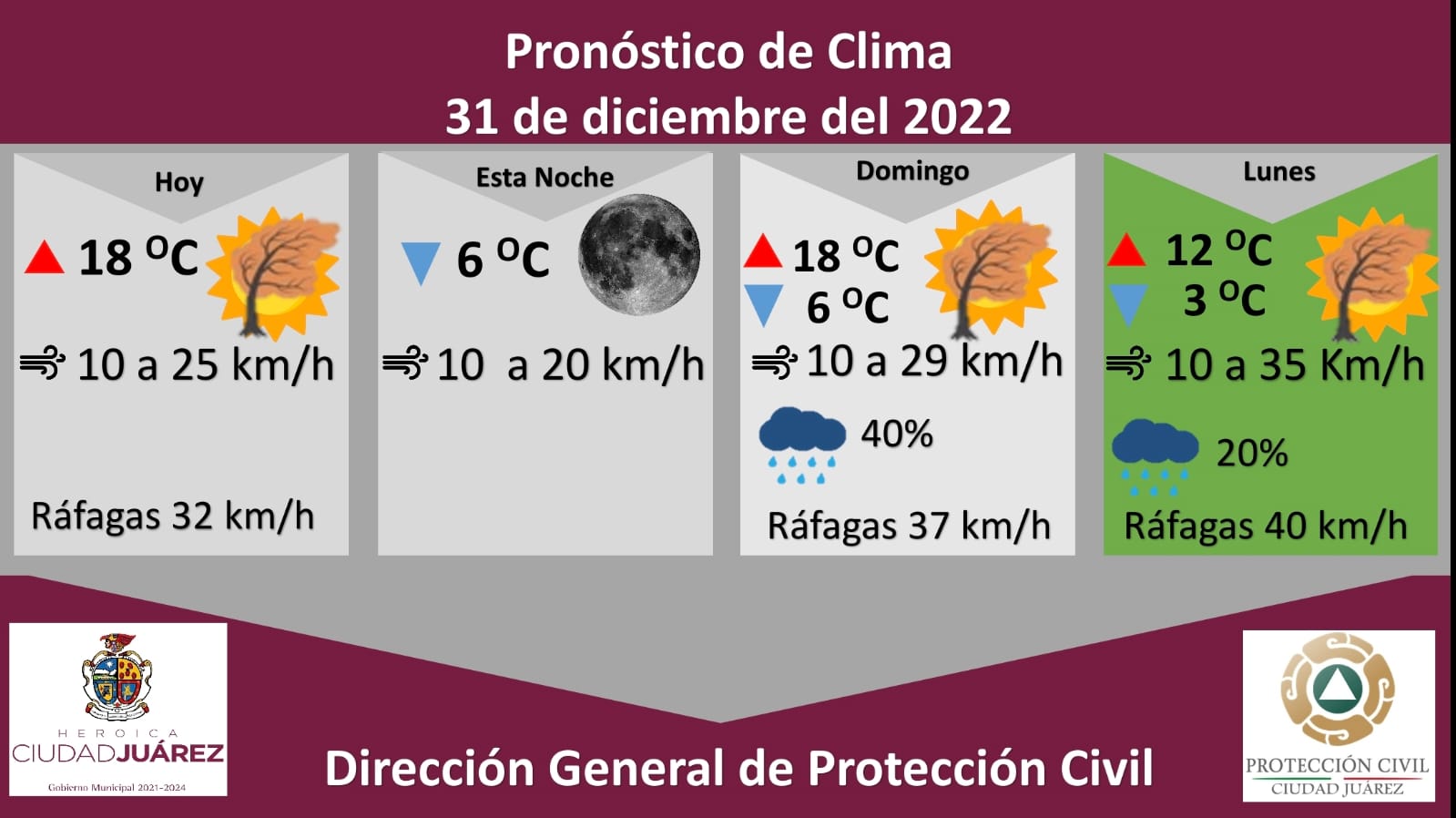 Este lunes la dependencia emitió una alerta verde, ya que se tendrá una reducción en las temperaturas y un incremento en los vientos, la máxima para ese día será de 12°C y la mínima de 3°C, con vientos de 10 a 35 kilómetros por hora y ráfagas de hasta 40 kilómetros.