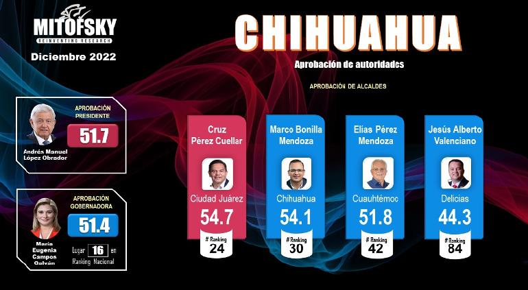 Consulta Mitofsky publicó los resultados de diciembre del 2022 de las encuestas de aprobación al Presidente, la Gobernadora y alcaldes de los principales municipios en el estado de Chihuahua.