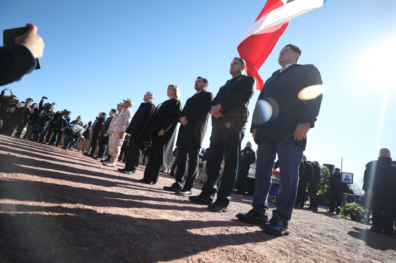Familiares, amigos y elementos de seguridad de las Fuerzas Estatales, estuvieron en la ceremonia que se efectuó en la explanada de la Megabandera en el parque El Chamizal, donde ondeaba la Bandera Nacional a media asta en señal de duelo.