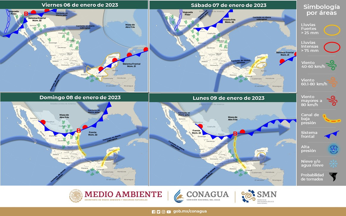 Mientras que para este sábado 7 y domingo 8 de enero, el Frente Frío número 22 recorrerá el territorio estatal y provocará temperaturas de gélidas a muy frías en la zona serrana con presencia de heladas durante las mañanas.