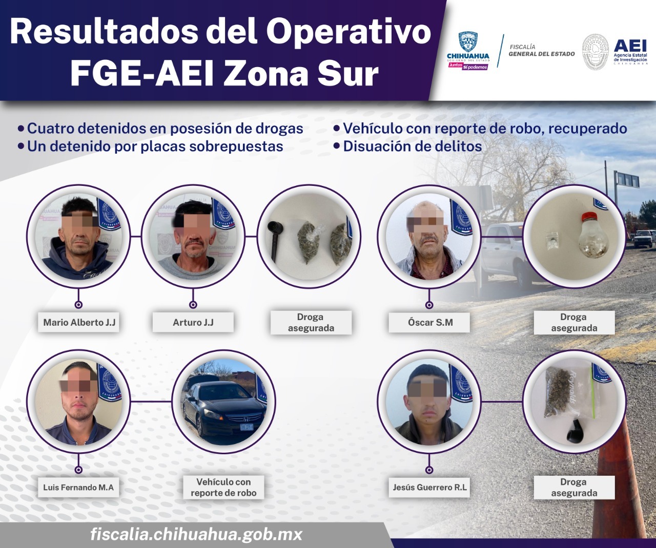 Durante un operativo para disuasión de delitos realizado en Parral y la región, elementos de la Agencia Estatal de Investigación y la Fiscalía de Distrito Zona Sur, capturaron a cuatro sujetos en posesión de drogas y uno en poder de un vehículo con placas sobrepuestas, el cual quedó asegurado.
