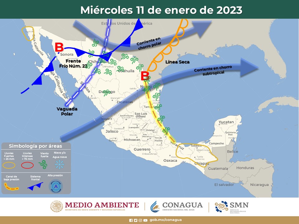 El frente frío Núm. 23, asociado con una vaguada polar y la corriente en chorro subtropical, se desplazará sobre el norte del territorio nacional e interaccionará gradualmente con una línea seca sobre Coahuila, originando vientos de 60 a 70 km/h y posibles tolvaneras en Chihuahua, Durango, Coahuila y Nuevo León.