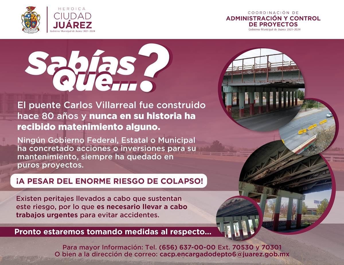 “El puente Carlos Villareal tiene 80 años sin recibir el mantenimiento debido y es urgente rehabilitarlo, previamente se hizo un estudio con ingenieros que nos indicaron que urge atender la estructura por que se encuentra en pésimas condiciones”, mencionó.
