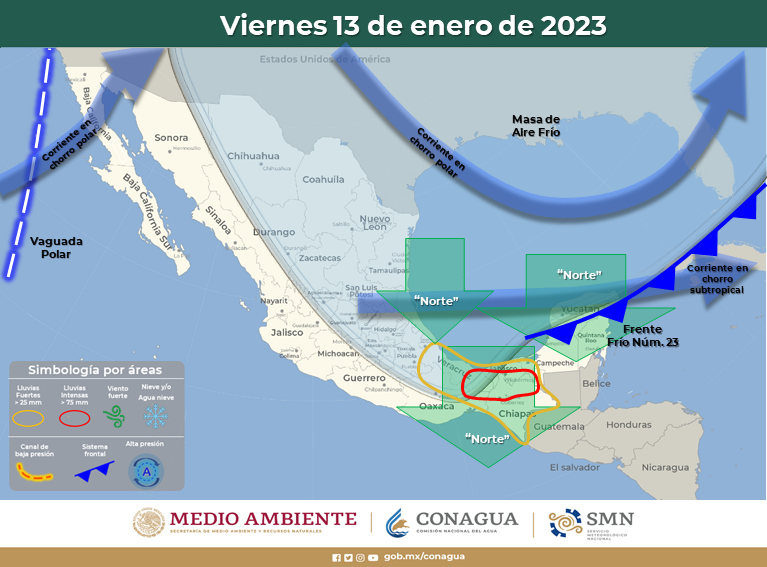 El frente frío Núm. 23 recorrerá rápidamente el sureste del territorio nacional y la Península de Yucatán, originará chubascos y lluvias fuertes en Puebla, Yucatán y Quintana Roo, con lluvias muy fuertes en Campeche y puntuales intensas en Veracruz, Oaxaca, Chiapas y Tabasco.