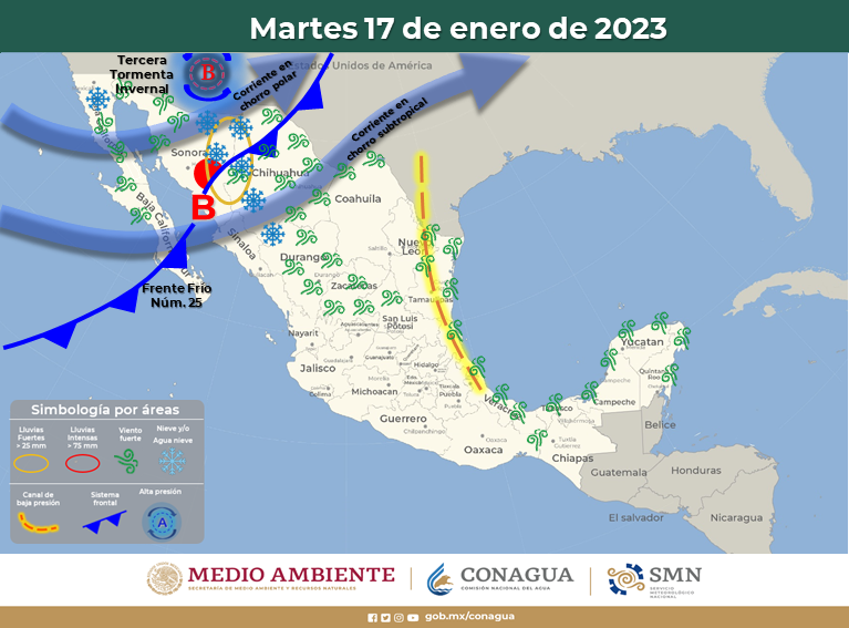 El frente frío Núm. 25 se desplazará sobre el noroeste y norte de la República Mexicana, mientras que la Tercera Tormenta Invernal se localizará al norte de Sonora y Chihuahua, manteniendo fuertes rachas viento con tolvaneras, ambiente gélido, lluvias y condiciones para la caída de nieve y/o aguanieve en zonas serranas de Baja California, Sonora, Chihuahua y Durango.