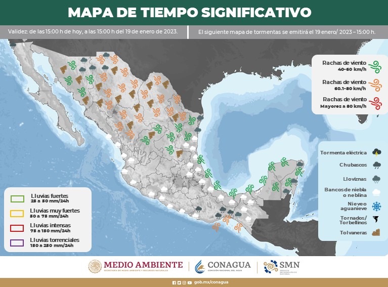 Por otra parte se prevé la presencia de vientos con rachas de entre 50 y 60 kilómetros por hora (km/h) en Casas Grandes, Carichí, Janos, Namiquipa, Guerrero, Bocoyna, Guachochi, Nonoava, Balleza, Cuauhtémoc, Majalca, San Francisco de Borja y Huejotitán, por lo que se esperan tolvaneras en tramos carreteros de las mencionadas zonas.