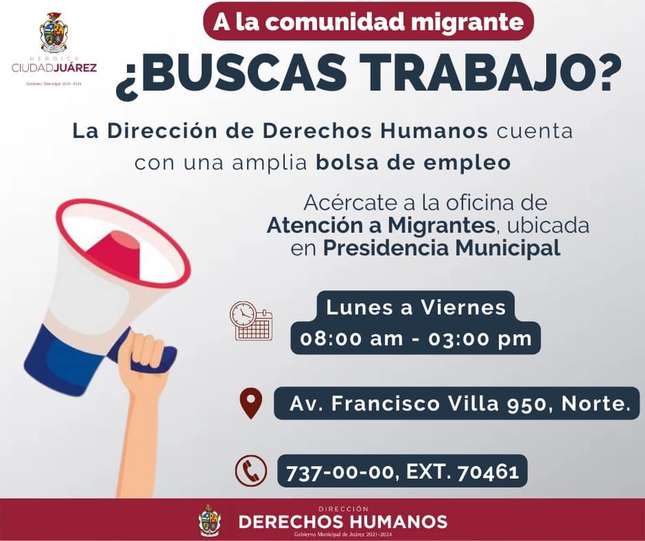 La Oficina de Atención a Migrantes, ubicada en la Unidad Administrativa Lic. Benito Juárez (Presidencia Municipal), atiende de lunes a viernes de 8:00 de la mañana a 3:00 de la tarde, para brindar asesoría o canalizar ofertas de trabajo.