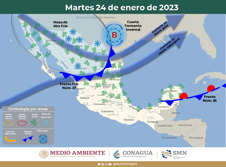 El frente frío Núm. 27 se desplazará gradualmente sobre el norte, noreste y oriente del país, continuará interactuando con la cuarta tormenta invernal, la cual se localizará al norte de Coahuila, aunado a las corrientes en chorro polar y subtropical, ocasionarán chubascos en Coahuila, Puebla y Veracruz, además en las primeras horas de este día, prevalecerán condiciones para la caída de aguanieve o lluvia engelante en el noreste de Sonora, norte de Chihuahua y norte de Coahuila.