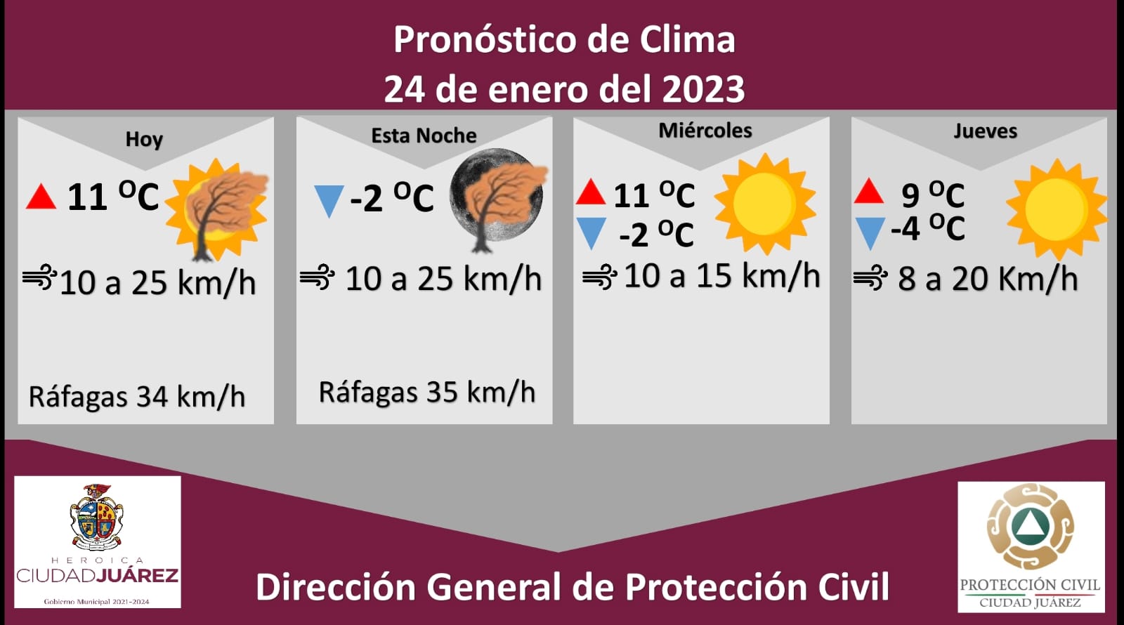 La Dirección General de Protección Civil, con base en informes del Servicio Meteorológico Nacional, pronostica una temperatura mínima de -2 grados Celsius para la noche de este martes, mientras que la máxima alcanzará los 11 °C, informó Roberto Briones Mota, titular de la dependencia.