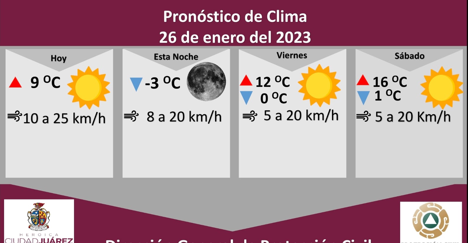La Dirección General de Protección Civil, con base en informes del Servicio Meteorológico Nacional, pronostica un jueves soleado con una temperatura máxima de 9 grados Celsius, mientras que la mínima será de -3 °C para esta noche.