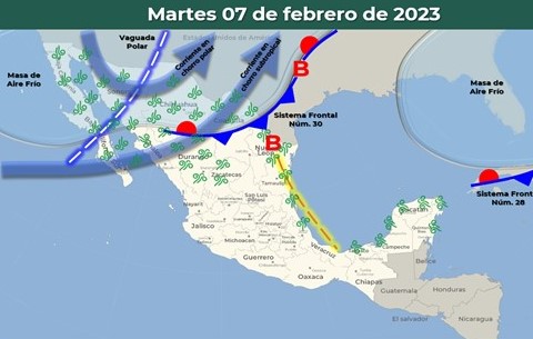 Para este martes, el frente frío número 30 y su masa de aire frío asociada en interacción con una vaguada polar y la corriente en chorro, favorecerá ambiente de muy frío a frío por la mañana, de fresco a templado por la tarde, temperaturas de gélidas a muy frías en la zona serrana con heladas, cielo de despejado a mayormente despejado.