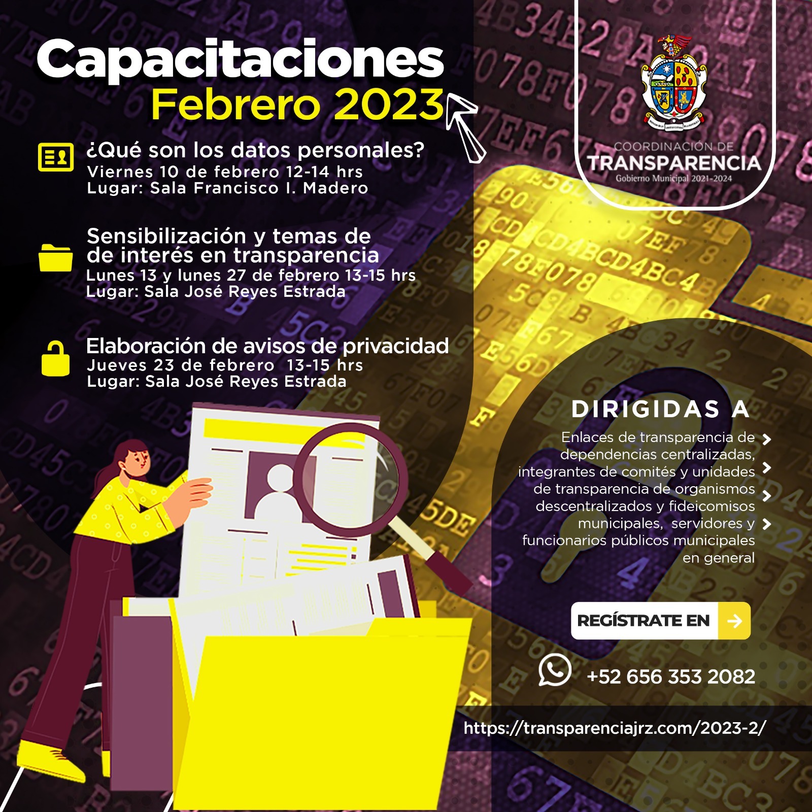 La titular de la dependencia, Valeria Aguirre Holguín, informó que el viernes 10 de febrero arrancará la primera capacitación titulada “¿Qué son los datos personales?” En horario de 12:00 del día a las 2:00 de la tarde en la sala Francisco I. Madero, en el tercer piso de la Presidencia Municipal.