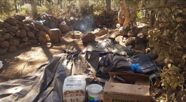 Agentes adscritos a grupo Zonas Rurales realizaban recorridos pedestres de vigilancia por los cerros en el seccional mencionado cuando localizaron el primer campamento, en el cual había restos de alimentos, hules, ropa y parapetos de piedra por lo que se procedió con su destrucción.
