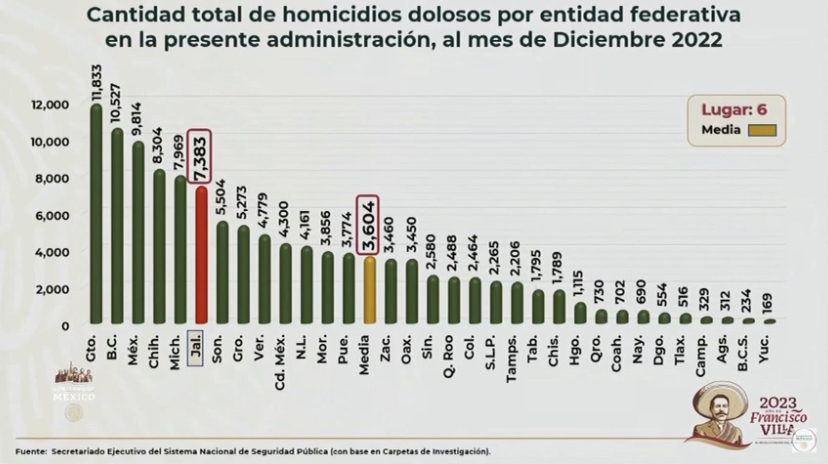 En primer lugar aparecen Guanajuato, con 11,883 homicidios dolosos; Baja California, con 10,527 y en tercer lugar el Estado de México, con 9,814, mientras que en quinto lugar se ubicó Jalisco, con 7,383.